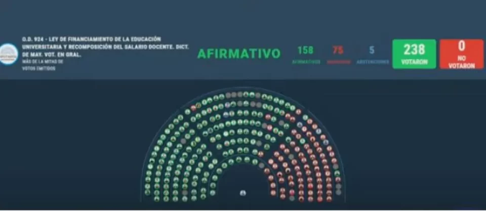 La Cámara de Diputados aprobó la Ley de Financiamiento Universitario con 158 votos afirmativos, 75 negativos y 5 abstenciones. El proyecto tiene como punto principal que el presupuesto destinado a la educación universitaria se incrementará de forma escalonada hasta alcanzar una participación del 1,5% del PBI en 2031.