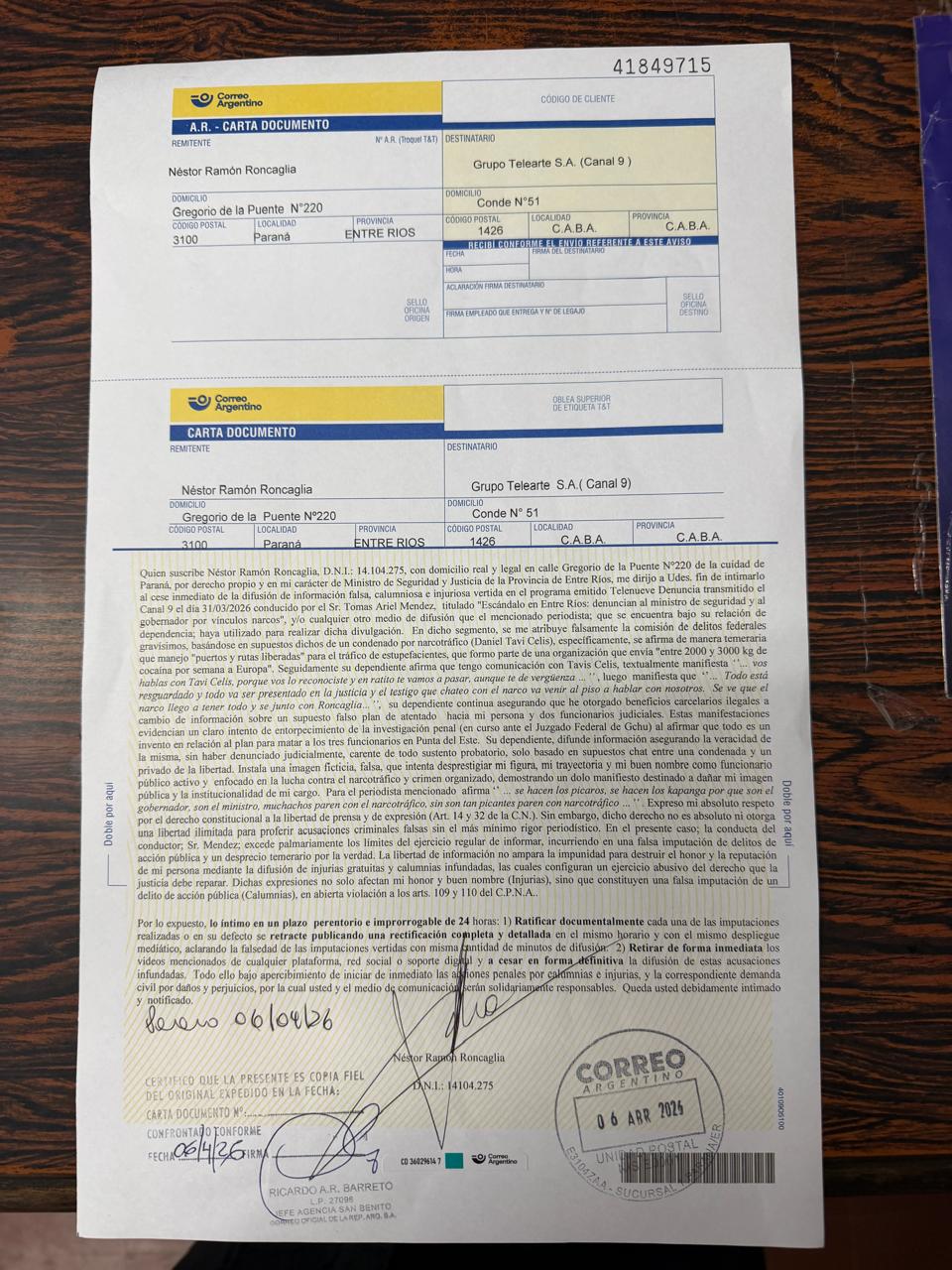 El Ministro de Seguridad y Justicia de Entre Ríos, Néstor Roncaglia, pasó a la ofensiva legal este lunes tras la difusión de un informe televisivo que lo vinculó, junto al gobernador Rogelio Frigerio, con estructuras del narcotráfico. El funcionario confirmó el envío de tres cartas documento dirigidas a las señales Canal 9 y Crónica TV, y al periodista Tomás Méndez, responsable del segmento Telenueve Denuncia.