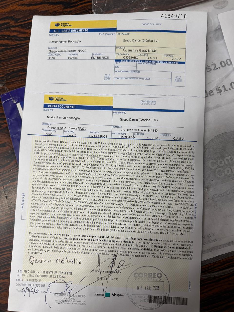 A través de las notificaciones legales, Roncaglia exige la rectificación de la información vertida en el programa, donde se sugerían conexiones entre funcionarios de alto nivel de Entre Ríos y el crimen organizado.