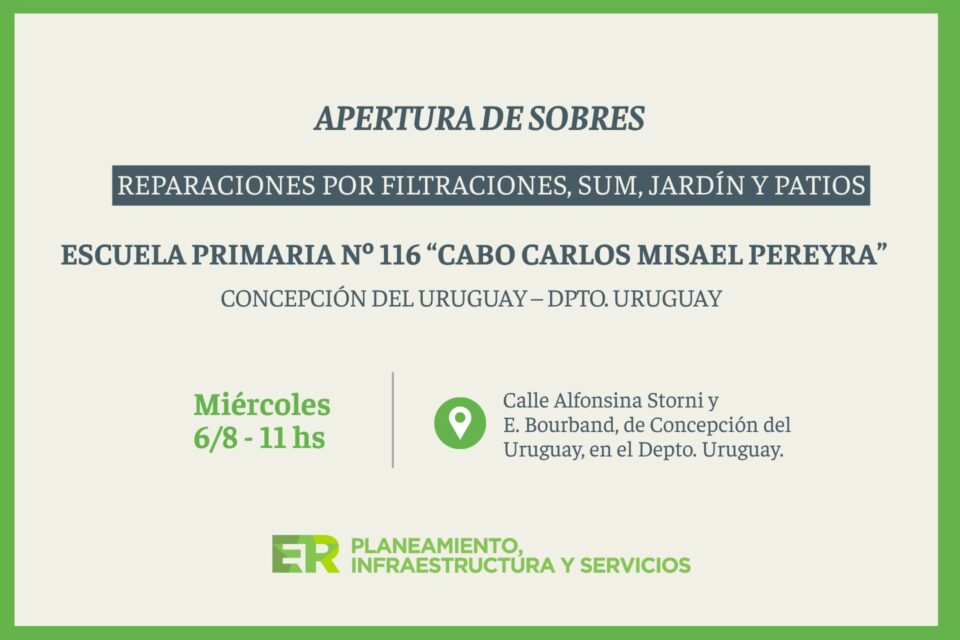 El gobierno de Entre Ríos realizará este miércoles 6 de agosto la apertura de sobres para ejecutar trabajos de reparación en la escuela Nº 116 Cabo Carlos Misael Pereyra, ubicada en el sector norte de Concepción del Uruguay.